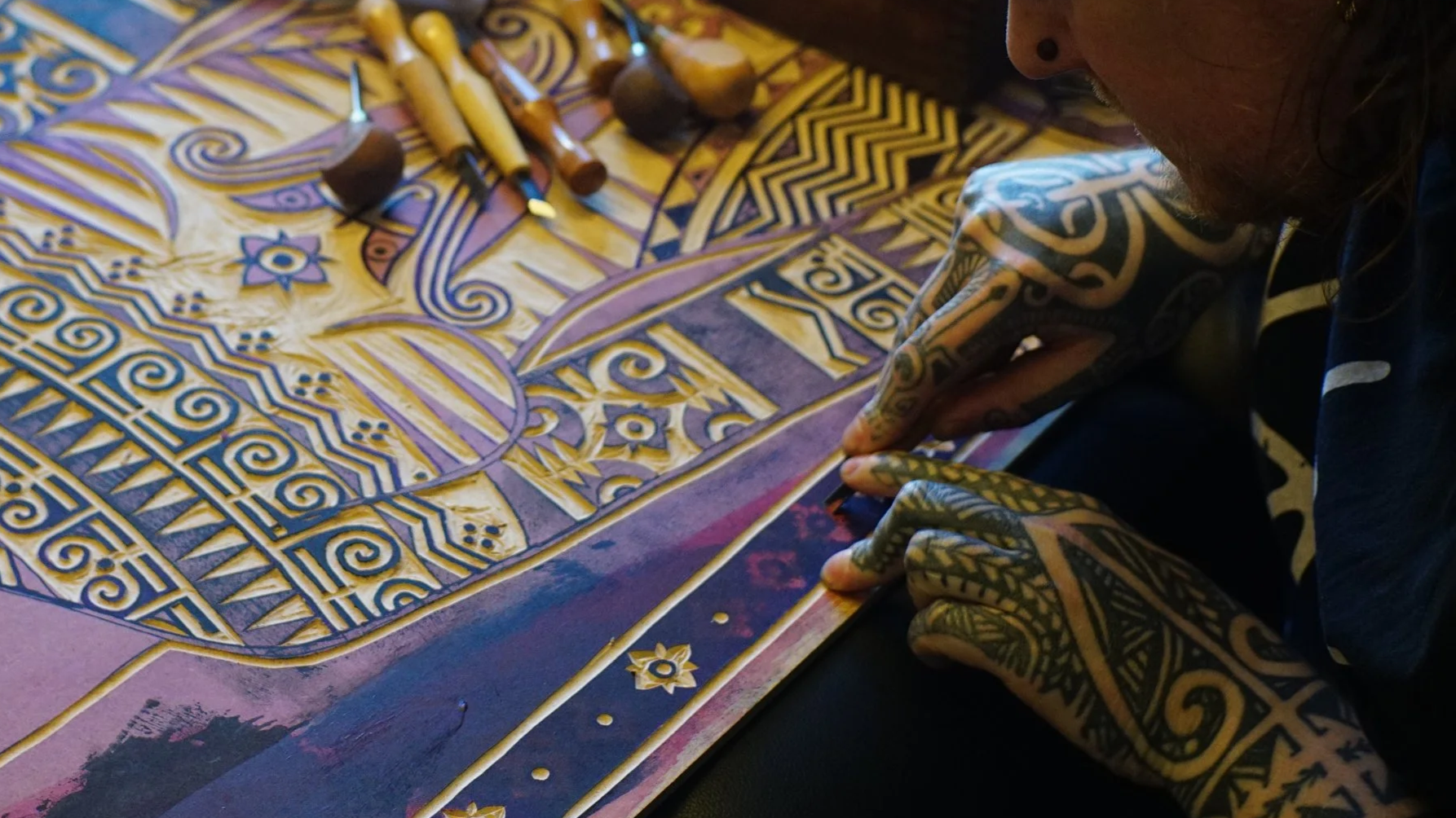 Often, my ideas from tattooing, cross over into what i carve for my print making… For as long as i can remember, i’ve been fascinated by large scale tattooing, so it feels like a natural progression to explore this subject often within my printmaking work.